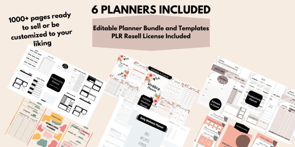 The PLR Bundle includes 6 made templates including productivity planners, weight loss planners, wellness planners, wedding planners, and homeschool planners. All these planners are able to be customized in canva to your liking or can be resold as is.